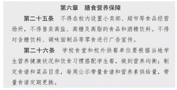 二是食品安全。主要包括学校食堂和校外供餐单位要建立健全食品安全管理制度,学校食堂要实施“明厨亮灶”和分餐制度,建立学校相关负责人陪餐制度和家长陪餐制度等内容。