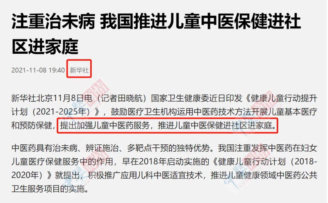 《中婴商情》:此次《健康儿童行动提升计划》中明确提出要积极推广应用小儿推拿等中医药适宜技术进社区进家庭,意味着疫情后中医药保健相关技术进一步得到国家的认可和推崇。