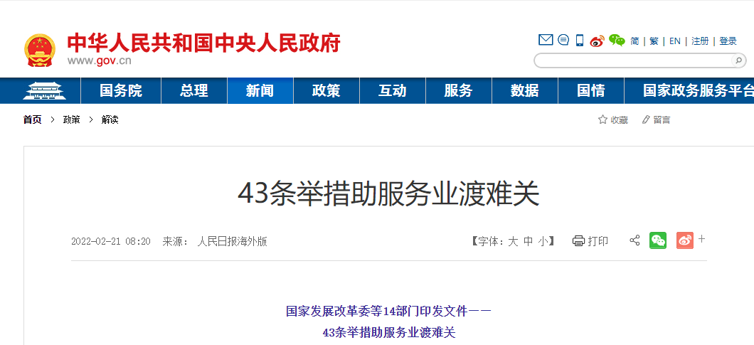 2月18日,国家发展改革委等14部门印发《关于促进服务业领域困难行业恢复发展的若干政策》(以下简称《若干政策》),从3个方面提出43条举措,帮助服务业渡过难关。国家发展改革委秘书长赵辰昕表示,这次服务业政策措施的着力点是针对行业面临的特殊困难,积极回应市场主体呼吁和关切,切实缓解服务业市场主体的成本压力,帮助企业恢复发展,保持全年服务业运行稳定。