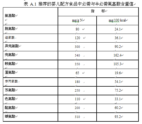 再乘以 1.88,结果参见表 A.1。建议婴儿配方食品中所含的必需和半必需氨基酸含量值不低于表 A.1 中