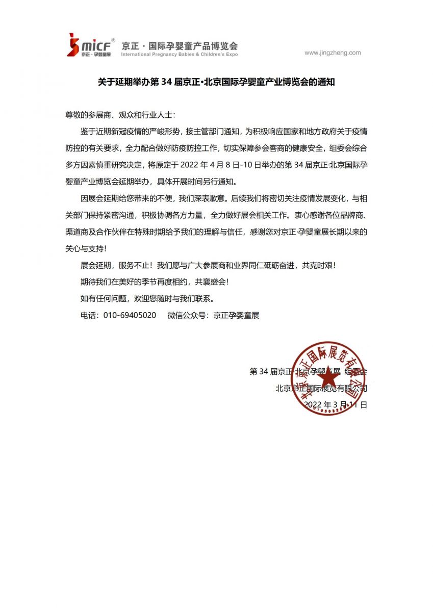 • 关于延期举办第 34 届京正·北京国际孕婴童产业博览会的通知