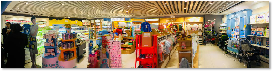 (三大特色区域,上、左下、右下分别为商品展示区、自助结算一体机区域、儿童游乐洽谈区域)