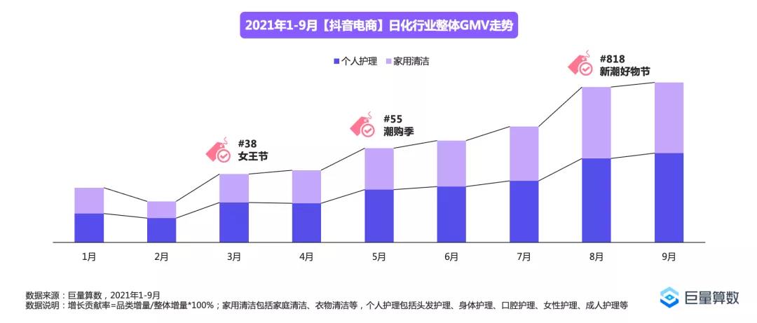 2021年1-9月,抖音电商日化行业GMV接近翻番,在电商节为代表的活动助推下,GMV量级不断迈向新台阶。同时,个人护理与家用清洁两大品类的增长势头基本保持同步。截至Q3,二者的年内增长贡献率分别为58%与42%。
