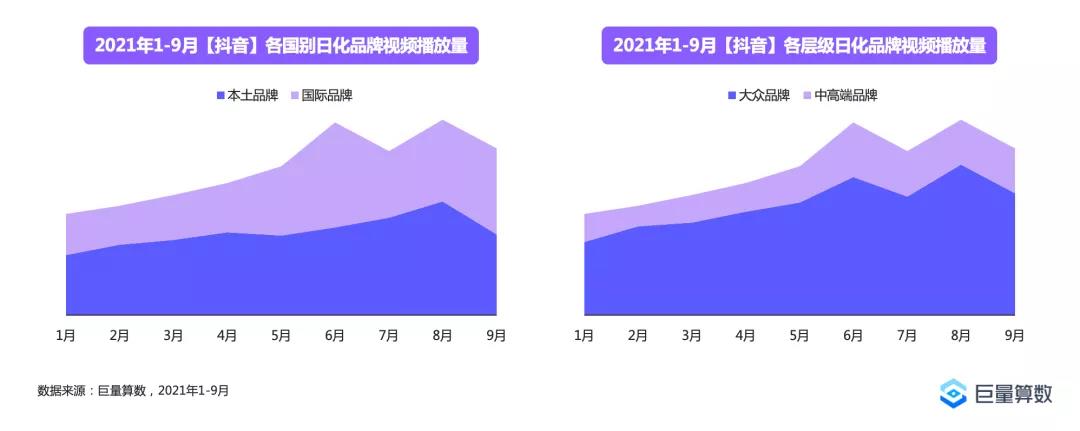 一直以来,抖音都是本土日化品牌生长的优渥土壤。在品牌内容总量持续增长的背景下,国际品牌亦于Q2开始发力,截至Q3,国际品牌内容较1月增长108%。尽管中高端品牌内容占比持续提升,大众品牌仍占主导,折射出亲民品牌的优势。