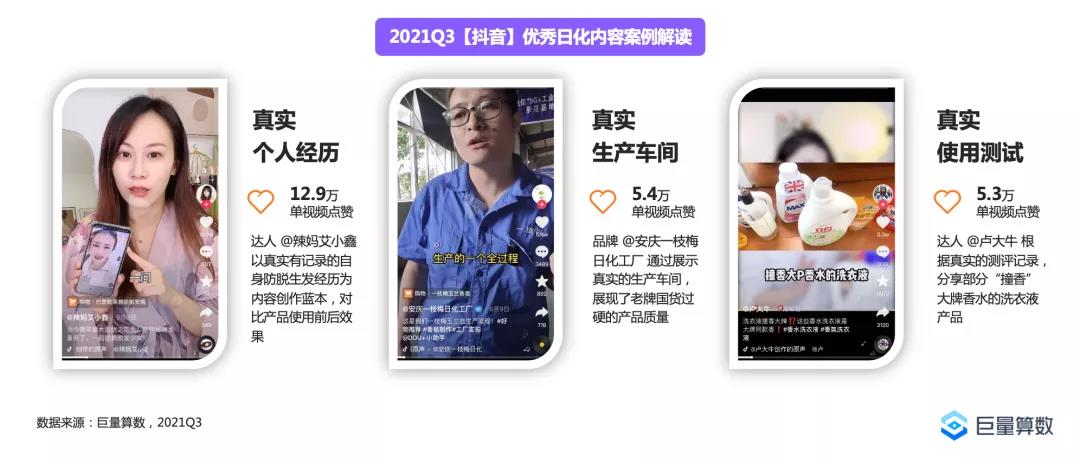 可以观察到,Q3的高赞日化内容多基于真实场景创作,特别是对功效、质量和产品创新点的展示,直接指向产品的差异化优势。