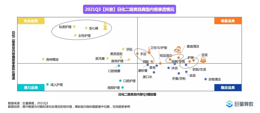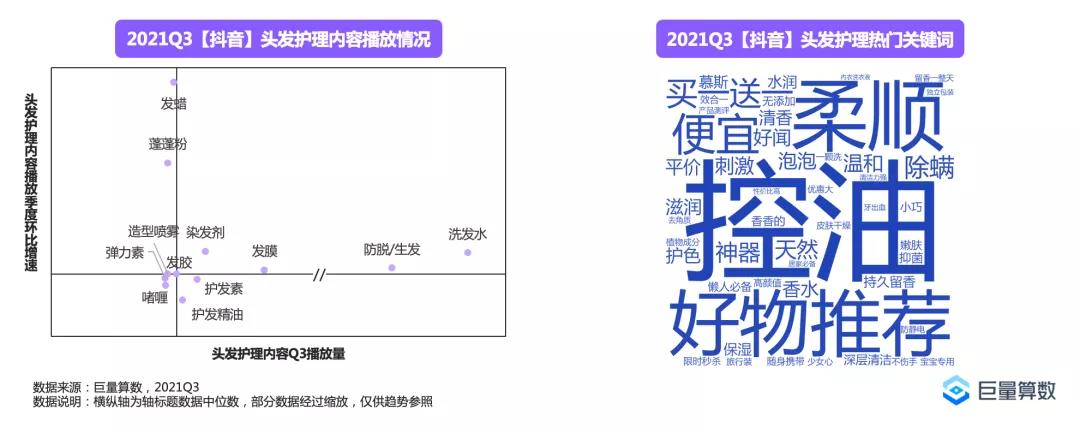 秋深渐入冬,季节更替带来的身体护理机会,将手足、润肤品类送入明星板块。洗发、护发凭借相对领先的内容播放总量与季度环比增速占据第一梯队。
