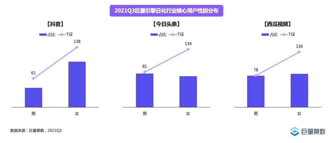 女性群体占抖音日化用户的绝对主导,头条与西瓜相对均衡