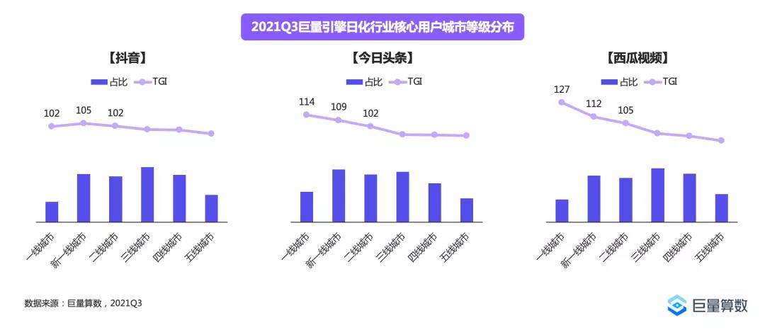 头条与西瓜方面,购买力更强的高线城市TGI优势明显,三线城市为TGI由高转低的“分水岭”;同时,西瓜三四线城市用户占比更高,下沉市场营销优势显现。