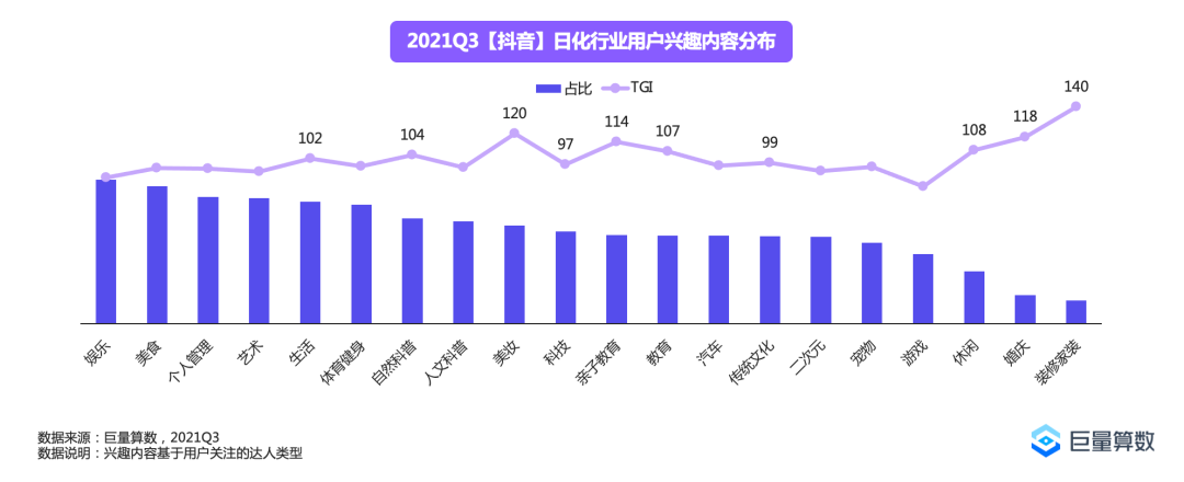 抖音日化行业核心用户占比较高的兴趣内容包括娱乐、美食、个人管理、艺术与生活,但同时保有高TGI的兴趣内容则集中在与家庭生活密切相关的生活、自然科普、美妆、亲子教育等,基本呈现出兴趣点以个人为中心,向家人,尤其是子女辐射的特征。