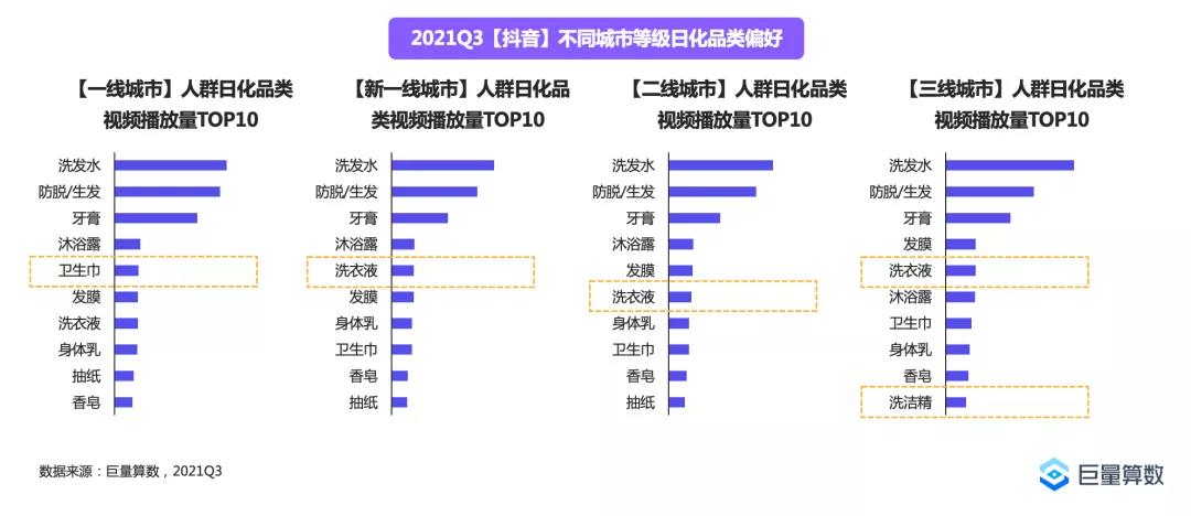 宏观来看,更多面向女性的日化品类播放量于Q3迎来高速增长,机会明显。家庭清洁大类与纸品湿巾内容需求坚挺。
