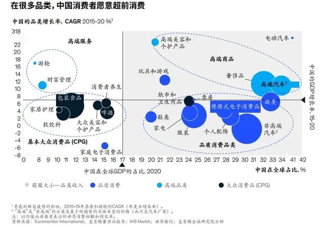 对于面向中高收入以上群体的消费品类来说,中国正成长为一个重要的市场。相对于中国在全球GDP中的占比,其在品质消费品类及高端消费品类中的支出占全球支出的份额更高。
