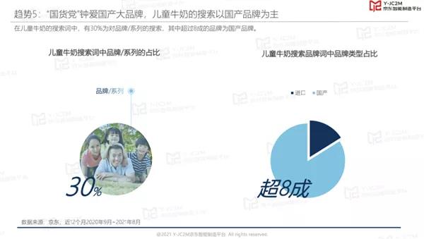 值得一提的是,父母们更钟爱国产大品牌。据《报告》显示,京东超市的儿童牛奶相关搜索词中,有30%为对品牌、系列的搜索,其中超过8成的品牌为国产品牌。如不少消费者在选购DHA牛奶产品的时候会直接关联搜索伊利QQ星品牌,国产品牌的影响力可见一斑。