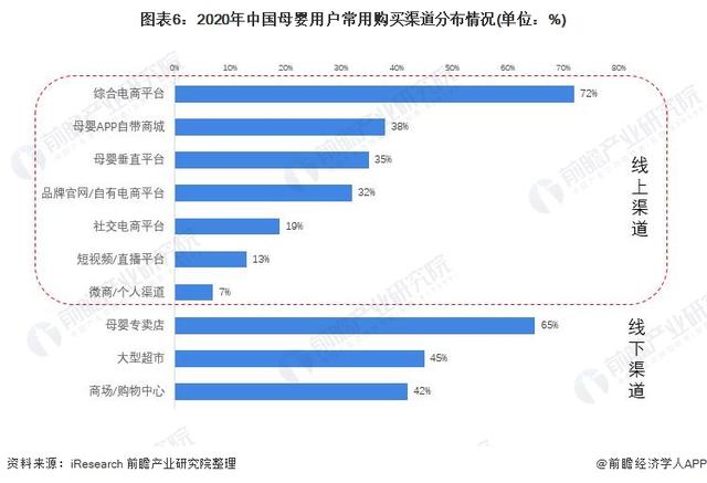从母婴用户的购买渠道集中度来看,有72%的用户青睐综合电商平台(天猫、淘宝等),垂直类电商平台占比35%。整体来看,我国母婴产品用户青睐线上渠道购物,其中以综合电商平台的购买频率最高。