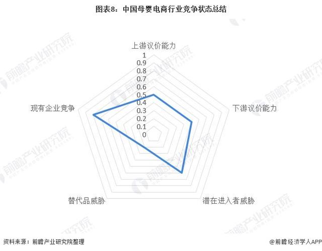 运用波特的“五力”模型,对母婴电商行业的竞争环境分析中,可以看到母婴电商行业竞争较为激烈,综合母婴电商平台的实力强劲。根据以上分析,前瞻对传感器制造行业各方面的竞争情况进行量化,1代表最大,0代表最小,我国母婴电商制造行业的竞争情况如下图所示。我国母婴电商制造行业“五力”中,上游供应商议价能力、下游议价能力以及替代品威胁较小,现有竞争者之间的竞争较为激烈,潜在进入者威胁适中。