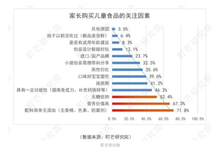 据町芒研究院在2021年发起的一项调查显示:家长购买儿童食品关注因素前三名分别为“配料简单不添加”“营养价值高”“无糖低钠”,分别占比71.8%、67.3%、52.4%。家长们对于“原汁原味”、“天然”的产品会比较信任,认为这些食品会较为“健康”。