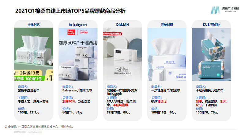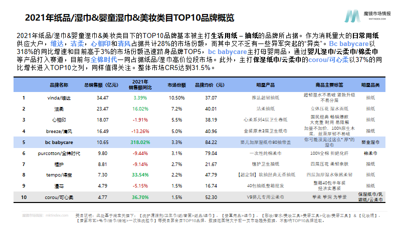 从品类上看,日常消耗的生活用纸(抽纸,卷纸)占据绝大部分市场份额,而特殊使用场景下的湿巾类和棉柔巾类产品则居于其后。2021年纸品/湿巾&婴童湿巾&美妆类目下的TOP10品牌分别为维达、洁柔、心相印、清风、babycare、全棉时代、植护、得宝、漫花、可心柔。
