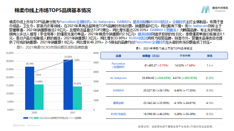 此外,护理用纸大类中的棉柔巾在近期线上增长态势相对良好,棉柔巾凭借着卸妆、擦脸等干湿两用的多场景覆盖以及母婴、美妆爱好者皆可用的多人群覆盖,到目前为止也稳定地占据了一定的市场份额。2021年棉柔巾线上市场销售额约56.13亿元,同比增长7.85%。2021年棉柔巾线上市场前5品牌分别为全棉时代、babycare、DAMAH、健美创研、可优比。