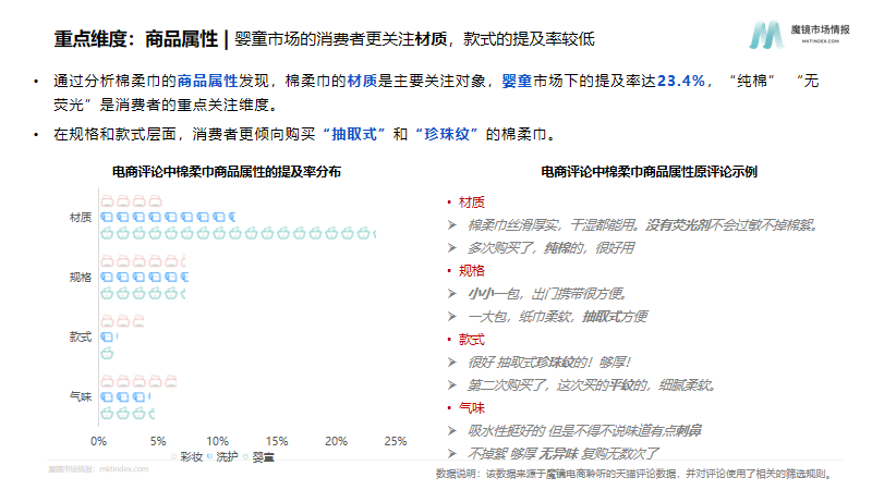 消费者对棉柔巾的评价中,从实用性来看,厚薄度是主要关注对象,其次是柔软度;从商品属性来看,材质是主要关注对象,纯棉、无荧光是消费者的重点关注维度;从场景来看,室内仍是主要使用场景,户外需求也在逐步增加。
