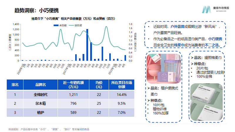 魔镜市场情报相关数据显示,淘宝+天猫平台纸品/湿巾行业2021全年销售额约273.58亿元,月销售额约22.80亿元。