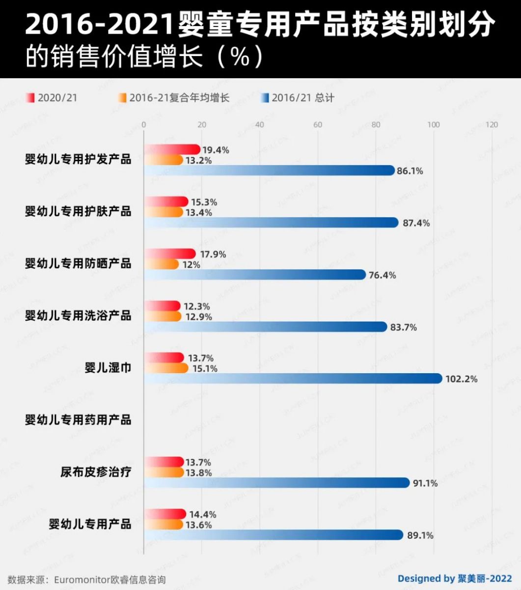 对于2021-2026年的各品类增长预测,如下图,可以看到婴童护发和防晒品类的增速都十分显著,均在50%之上。