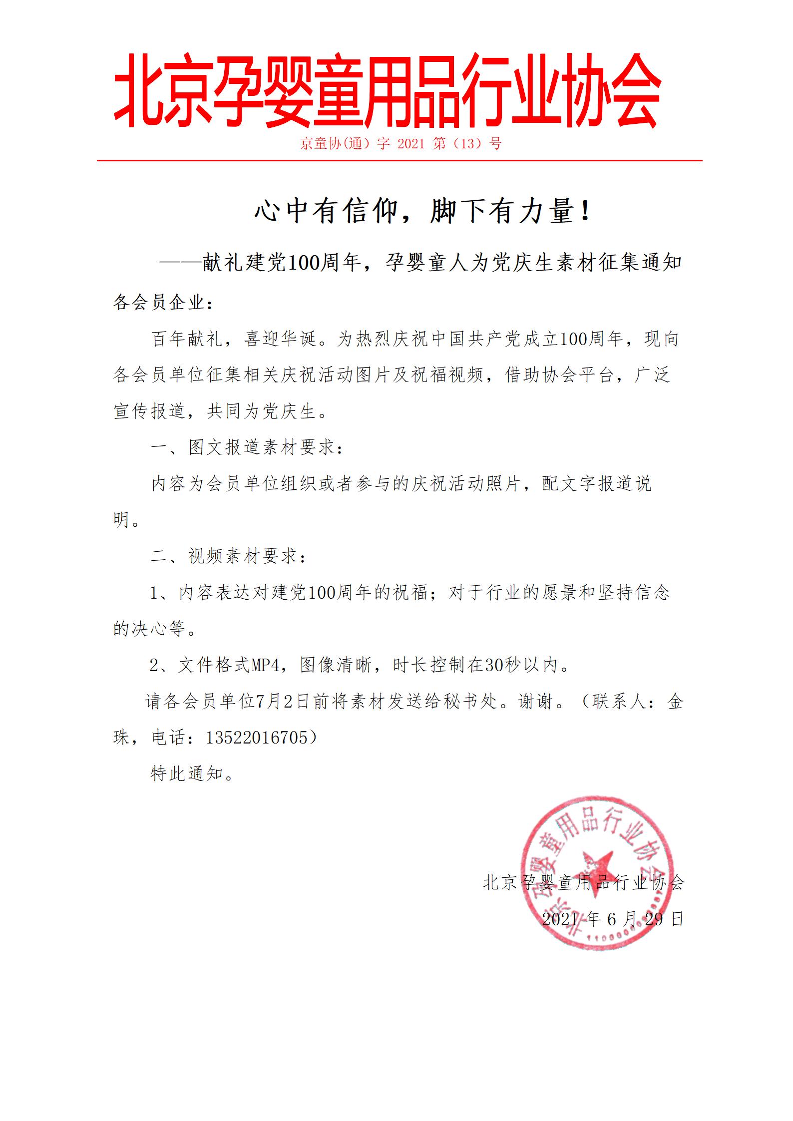 心中有信仰,脚下有力量!——献礼建党100周年,孕婴童人为党庆生素材征集通知各会员企业: 百年献礼,喜迎华诞。为热烈庆祝中国共产党成立100周年,现向各会员单位征集相关庆祝活动图片及祝福视频,借......